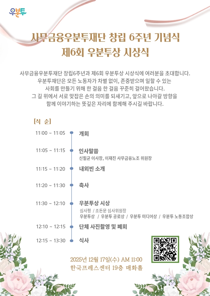 □ 제6회 우분투상 시상식은 오는 12월 17일(수) 오전 11시, 한국프레스센터 19층 매화홀에서 열리는 사무금융우분투재단 창립 6주년 기념식에서 진행된다.